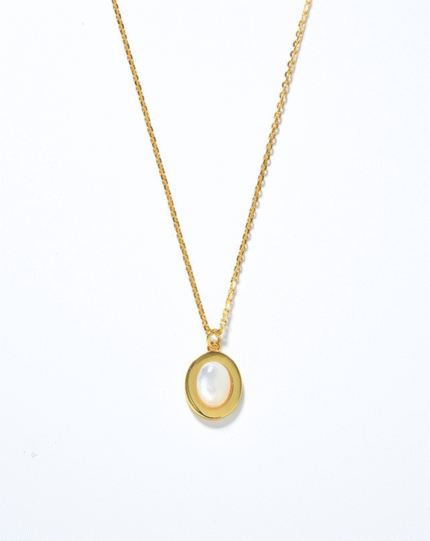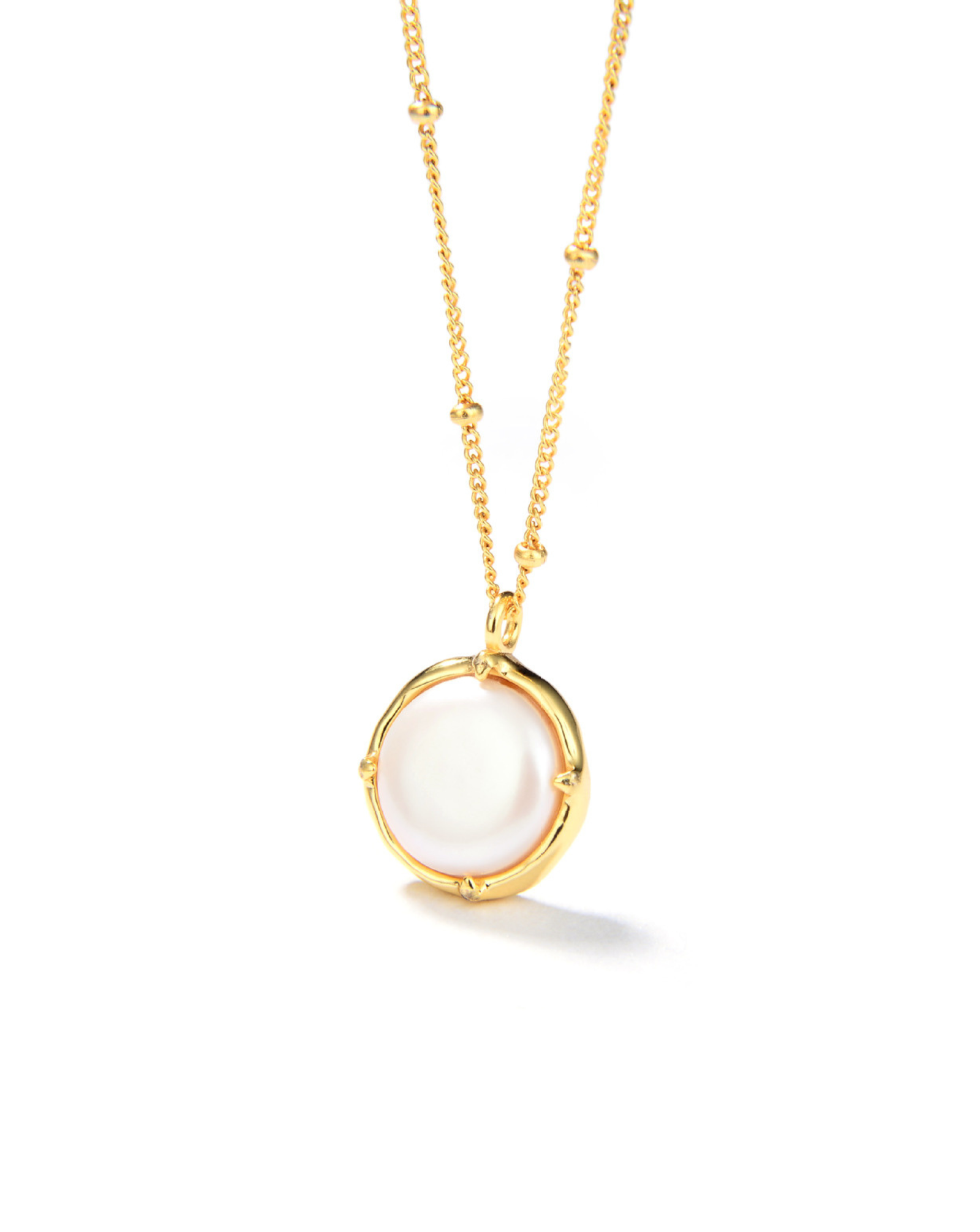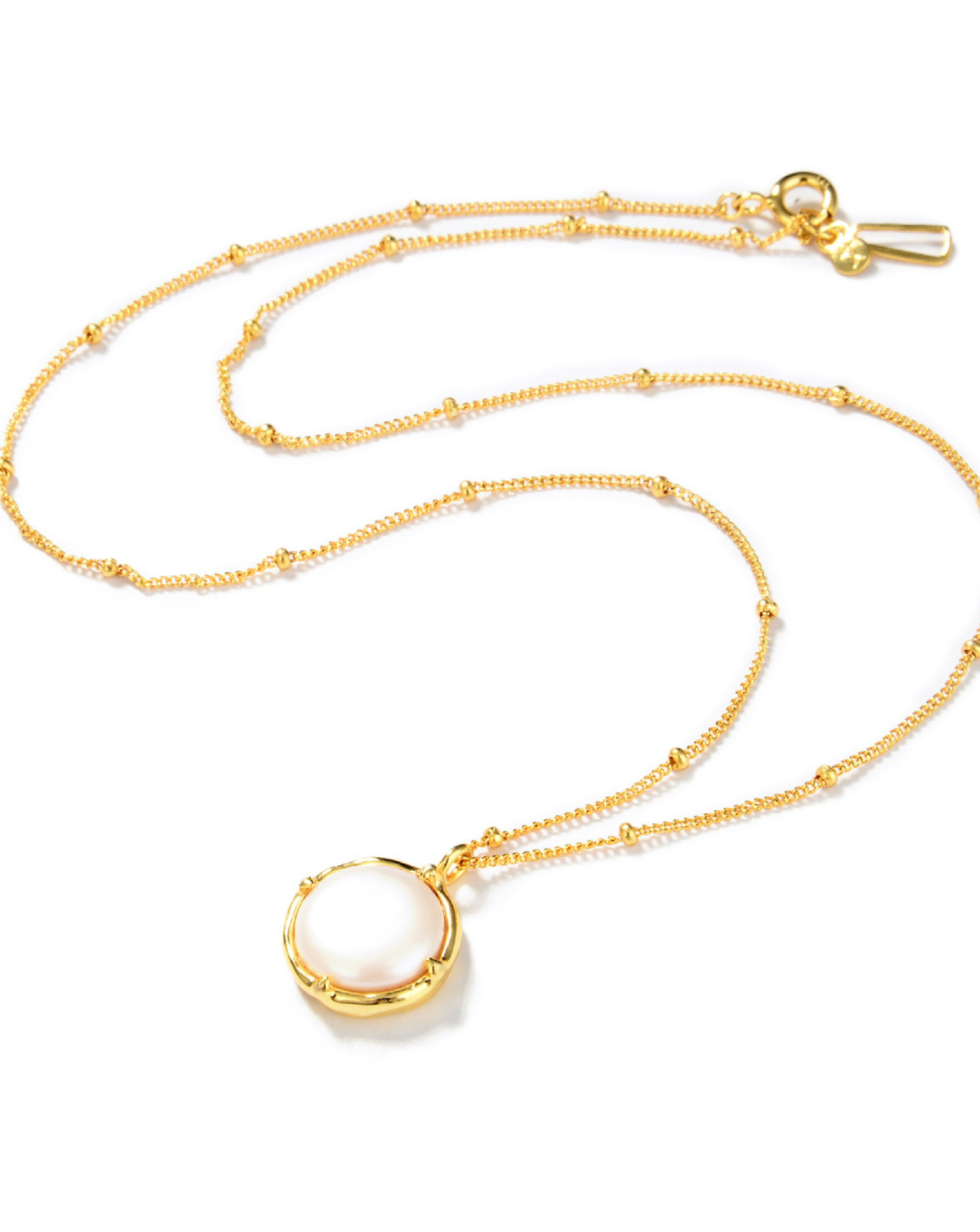 This elegant necklace features a natural freshwater baroque button pearl, highlighting its organic texture and soft luster. Framed in an 18K gold-plated bezel and paired with a refined chain, it’s a timeless piece perfect for everyday wear or layered styling.
