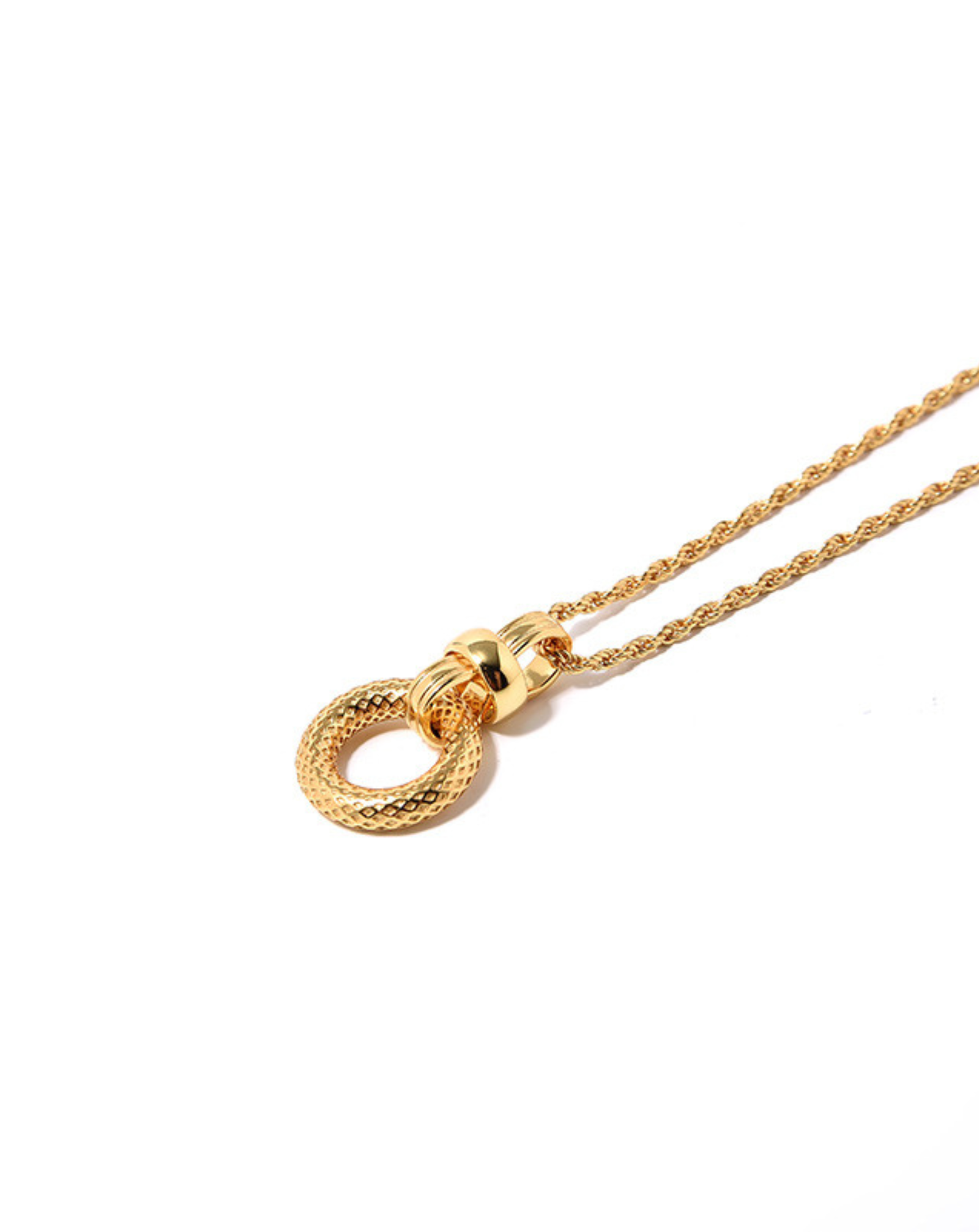 This circular pendant necklace features a textured ring design paired with a sleek chain, offering an elegant and timeless look. The circle symbolizes wholeness and balance, making it a perfect piece for everyday wear or layered styling.