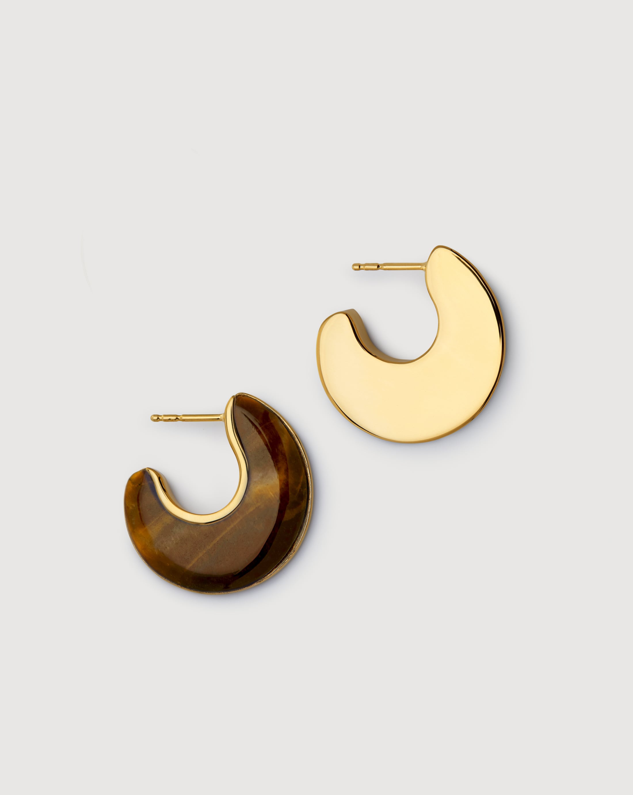 Inspired by the curve of the moon, these crescent-shaped earrings feature natural Green Aventurine or Tiger’s Eye set in S925 sterling silver with gold or silver finish. A refined statement for everyday elegance.