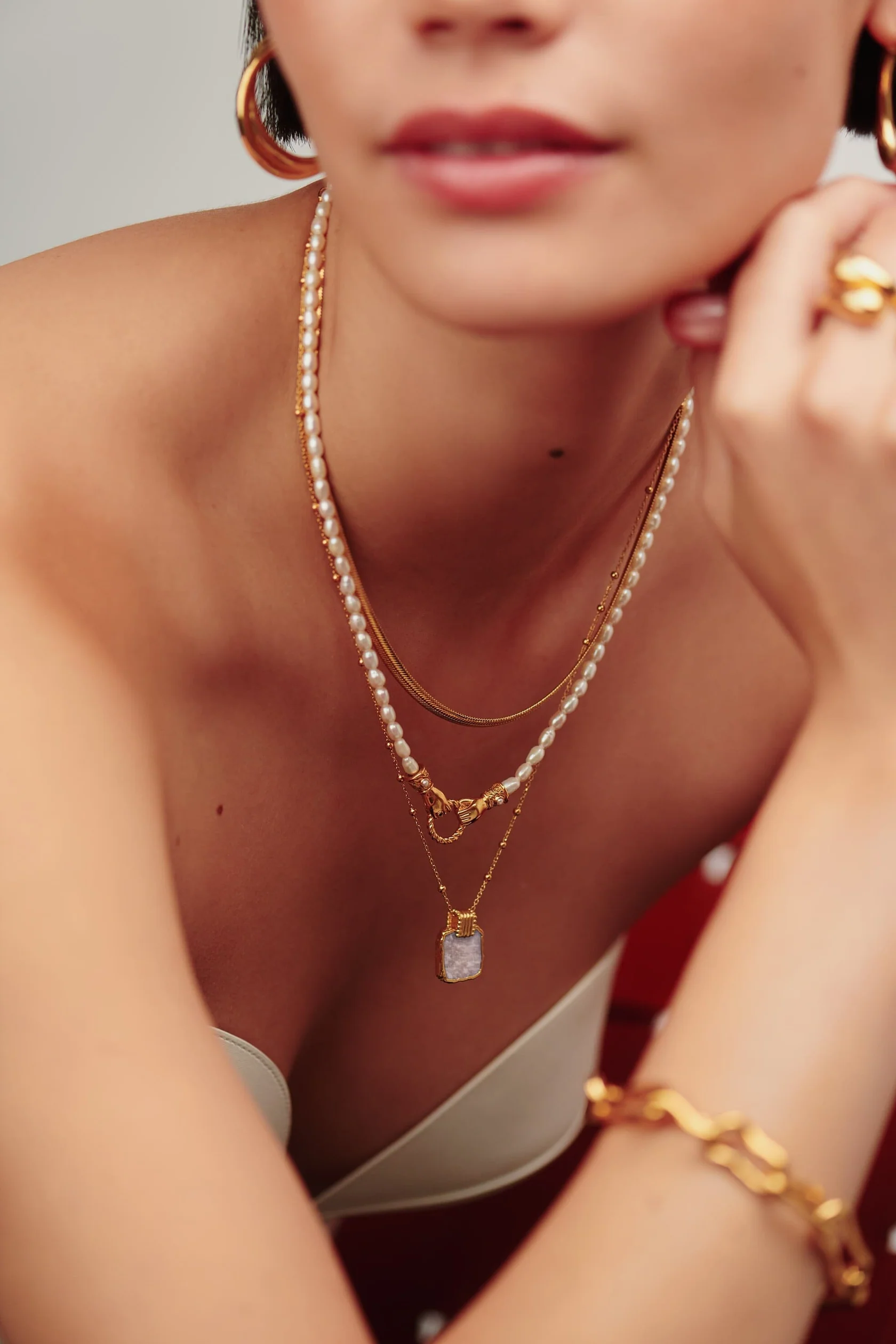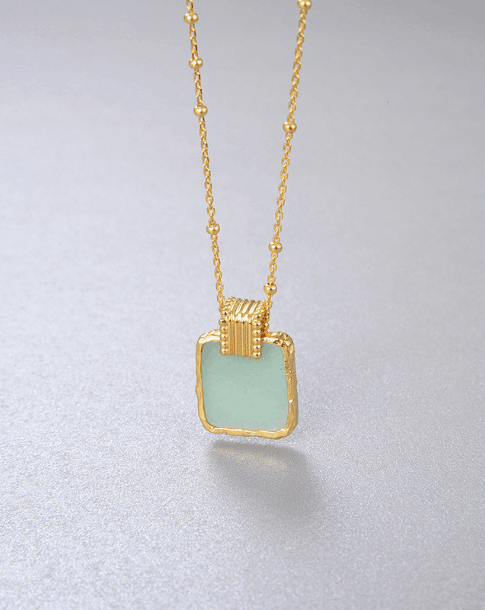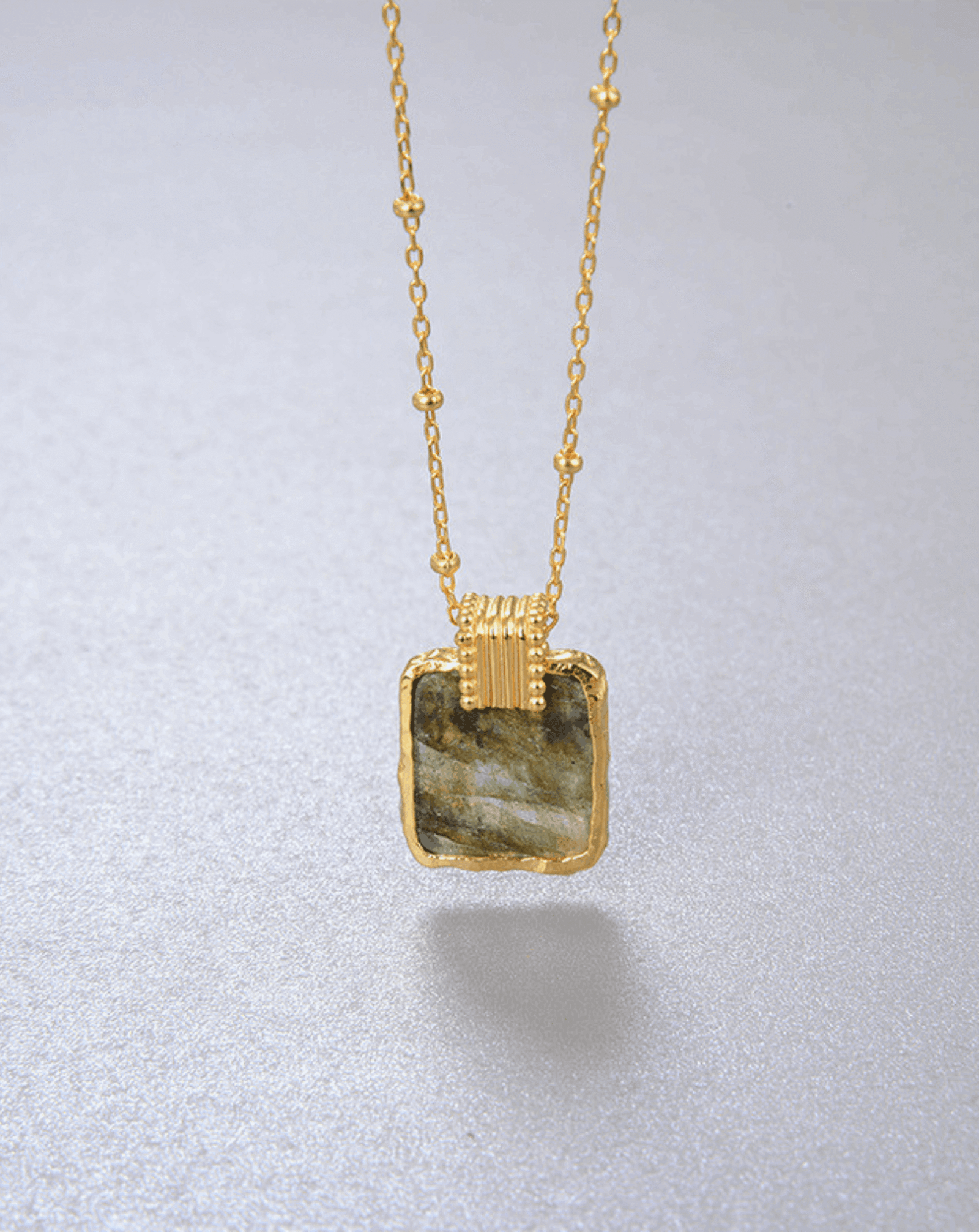 Each necklace features a natural gemstone, radiating its own unique color and energy. Rhodochrosite, moonstone, amazonite, labradorite, and green aventurine each symbolize distinct natural powers and emotional meanings. Crafted in 18K gold-plated sterling silver, it’s a minimalist yet elegant piece—perfect for everyday wear or as a thoughtful gift.