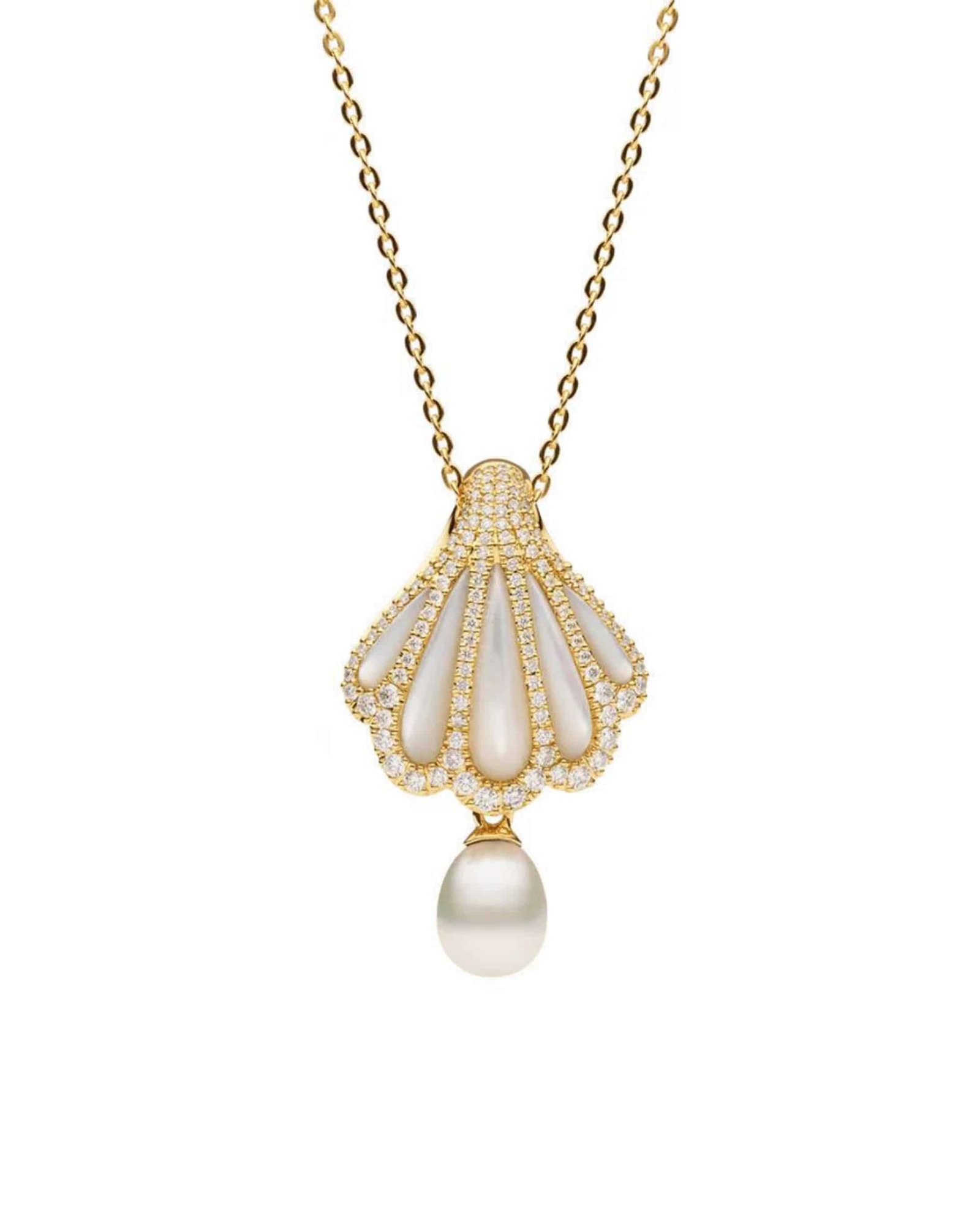 A luminous mother-of-pearl shell pendant with a freshwater pearl drop—luxurious, feminine, and versatile.