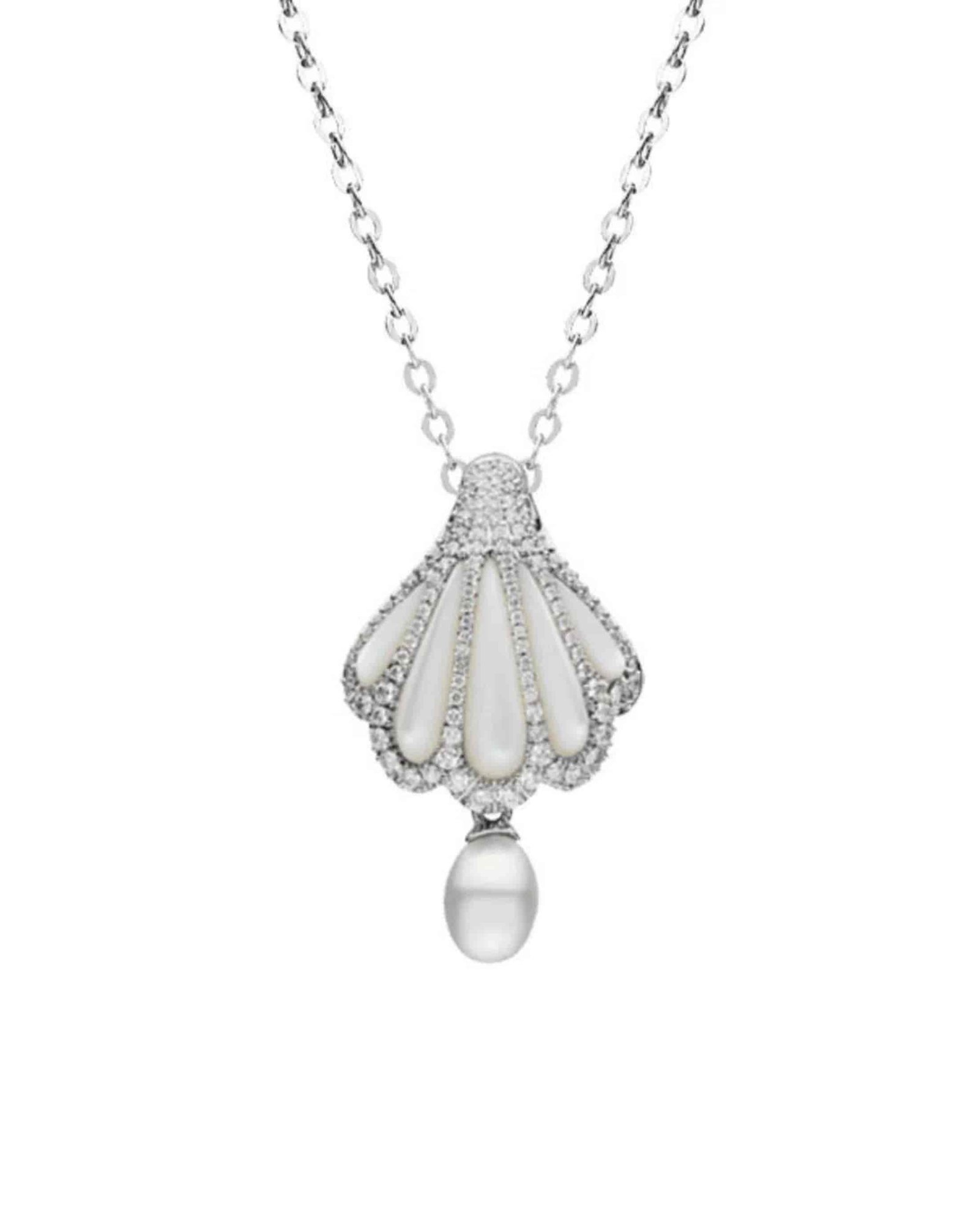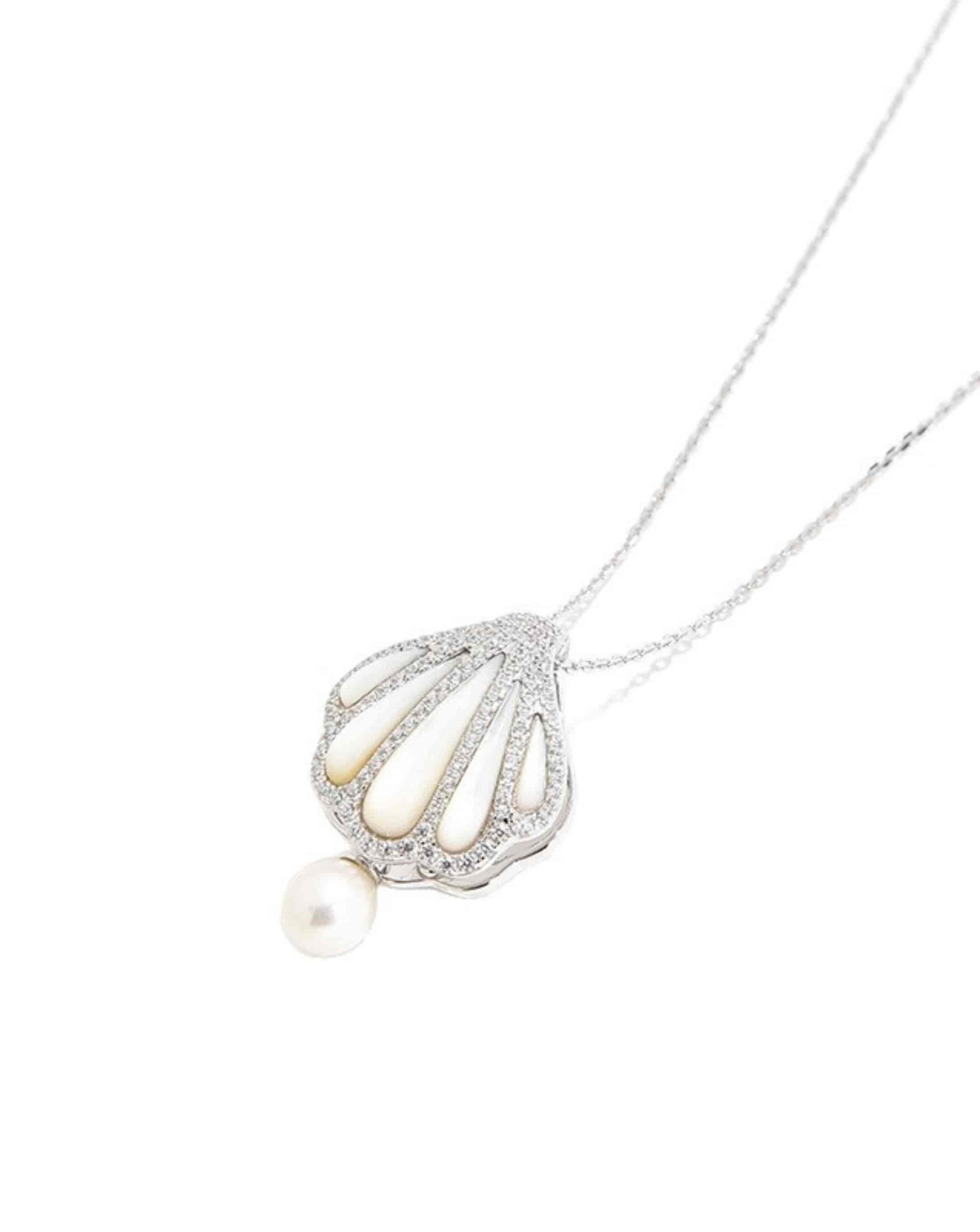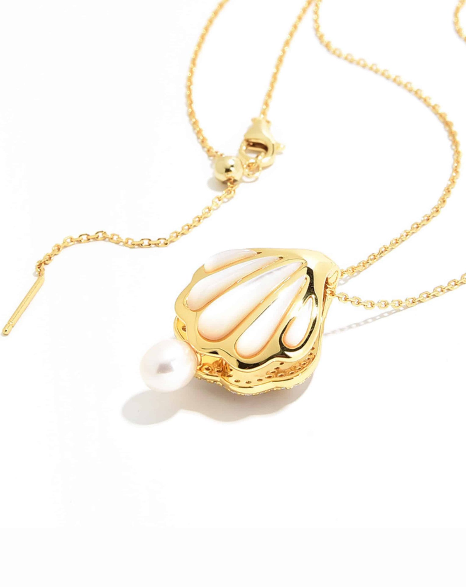 This elegant necklace features a seashell-inspired pendant adorned with natural mother-of-pearl and a freshwater pearl drop. The intricate detailing and refined 925 silver craftsmanship create a soft, luminous look. With an adjustable chain, it’s perfect for everyday wear, summer outfits, and vacation styling.