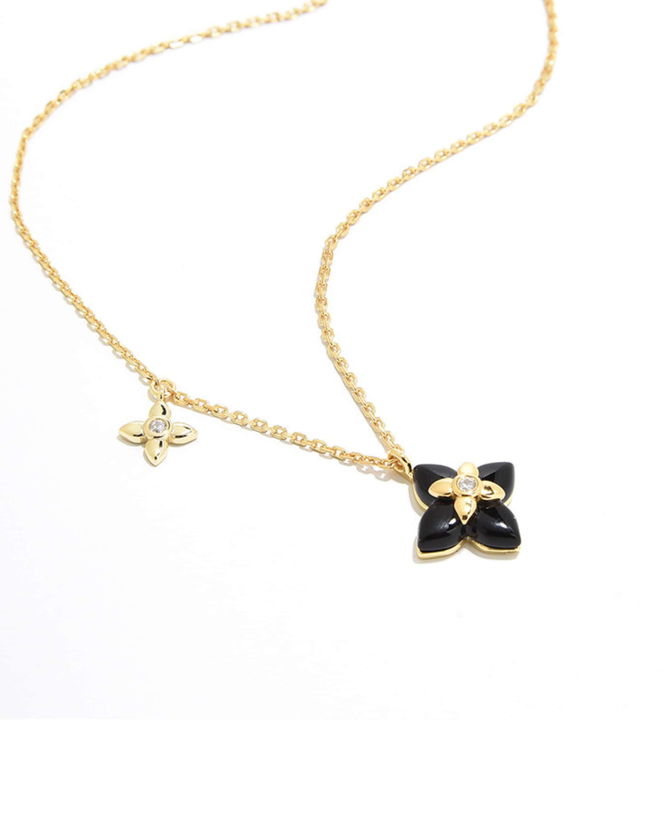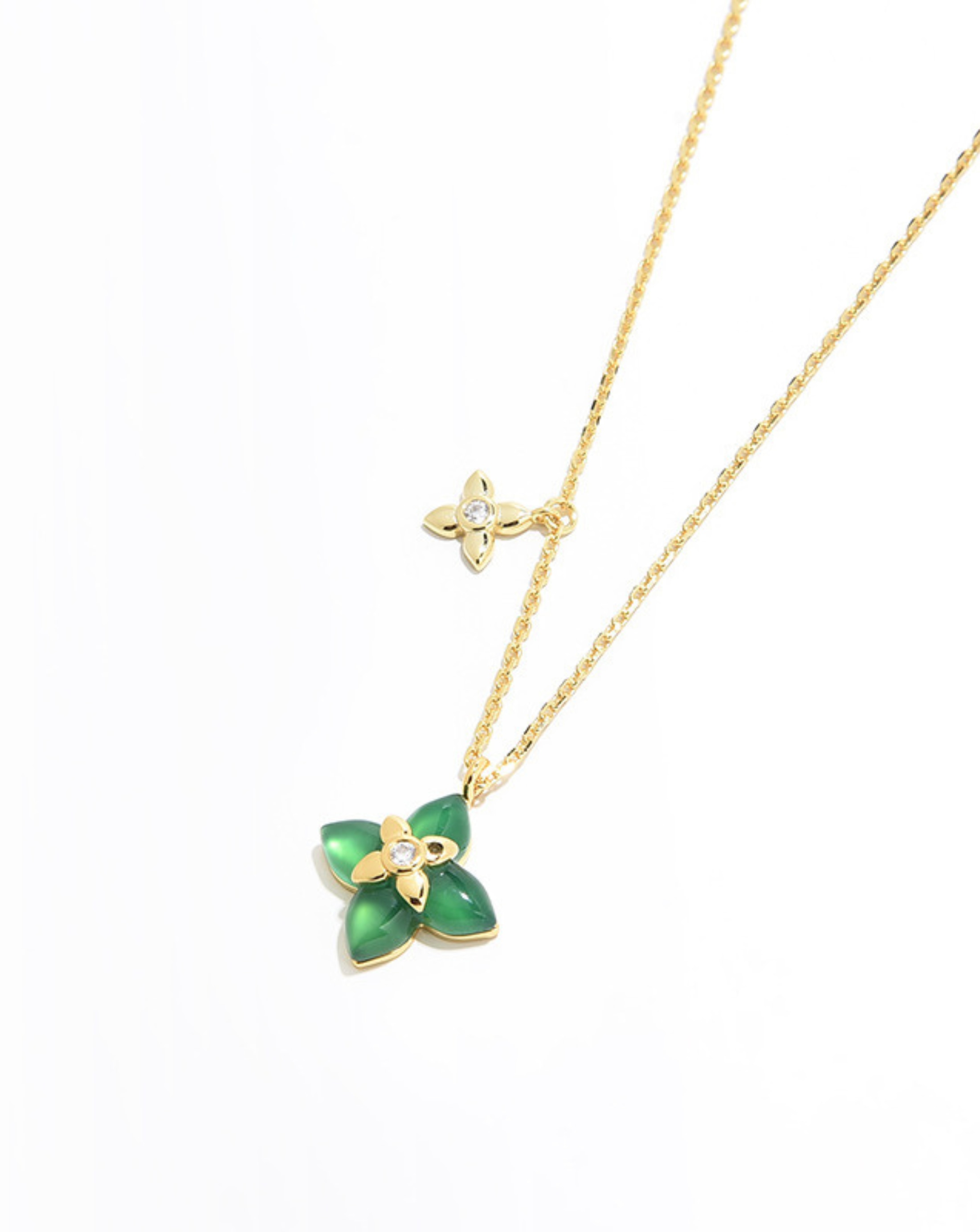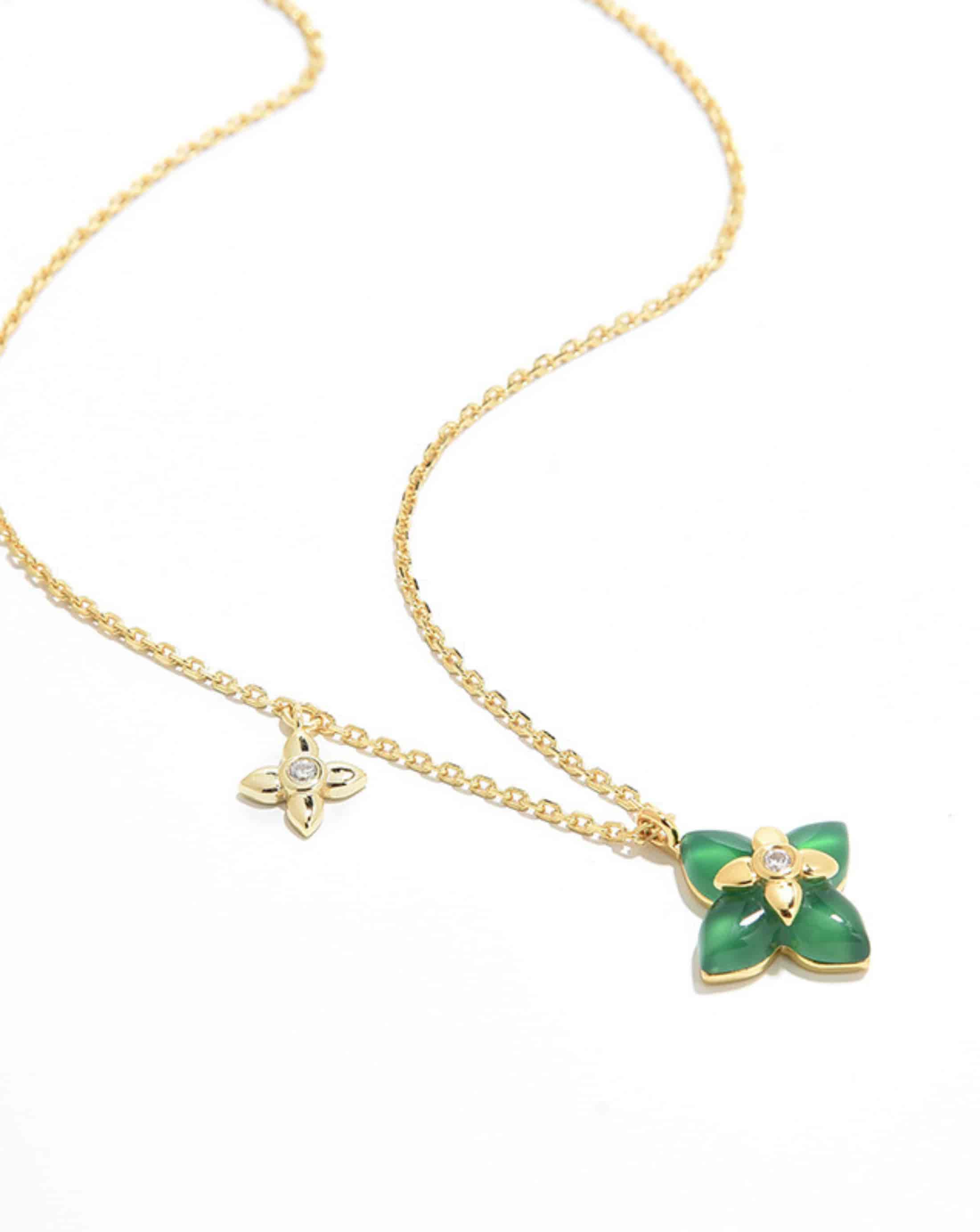 A French-inspired four-leaf flower necklace crafted with natural agate and gold-plated sterling silver. Elegant, refined, and perfect for everyday wear or layering.