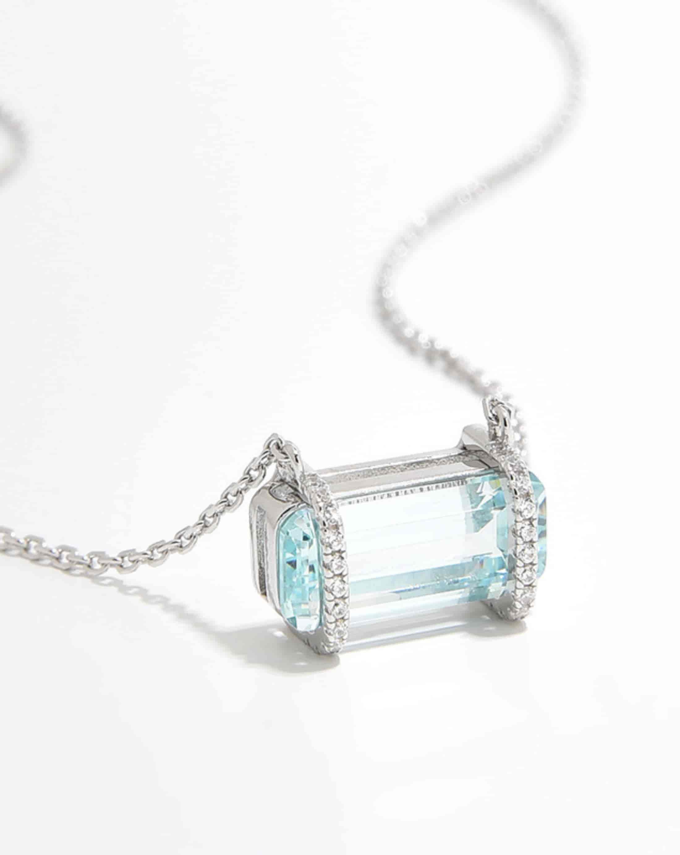 Inspired by glaciers, this ice-cube cut blue crystal necklace reflects a clean, refreshing glow.