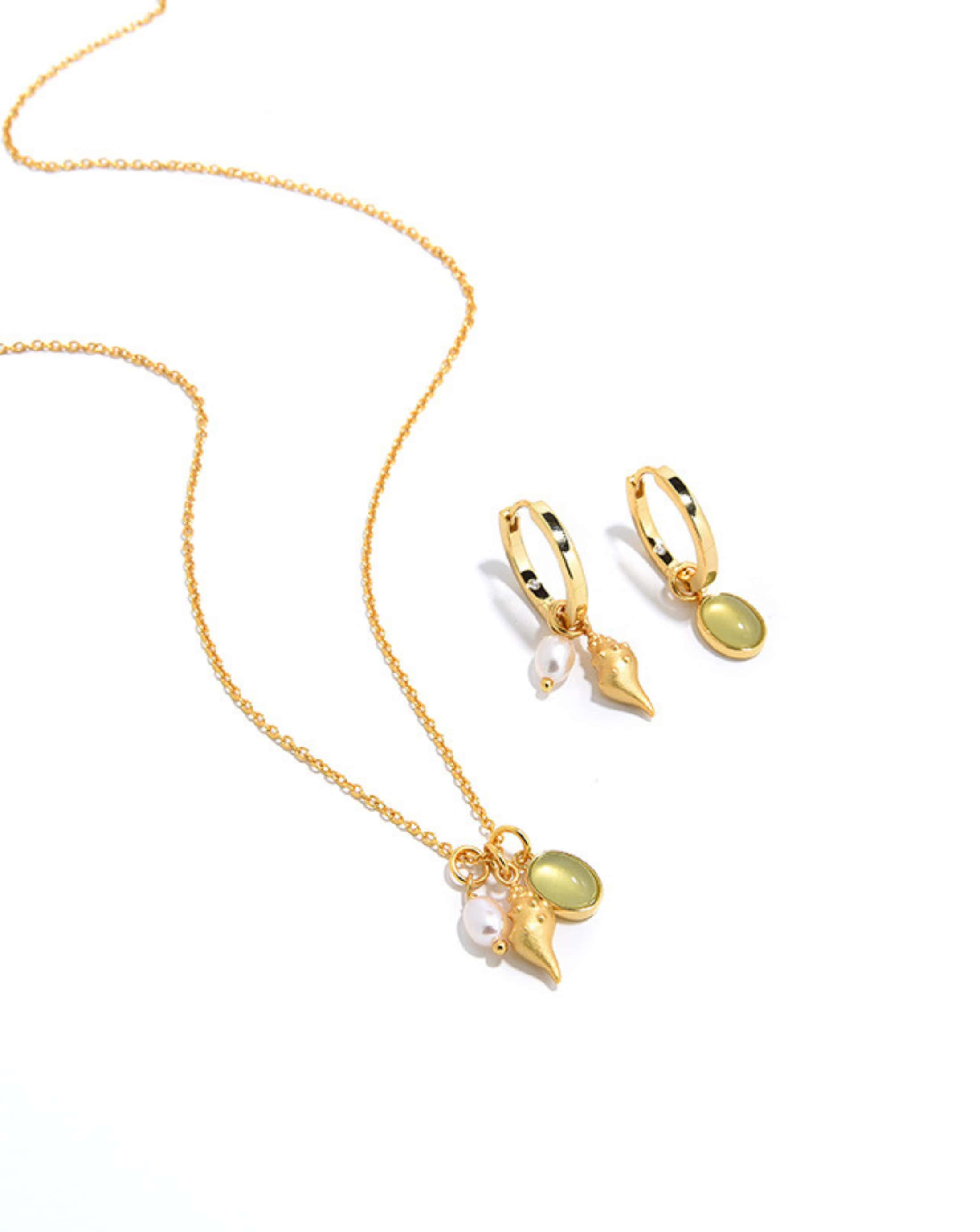 Crafted from S925 sterling silver with a gold-plated finish, it features a graceful shell pendant accented with a natural pearl and a soft glass charm, creating a subtle bohemian feel.